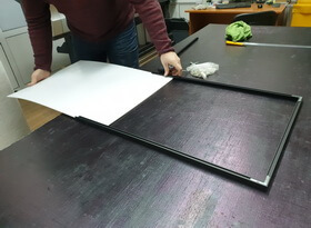 Затем из металлического профиля мы изготавливаем рамку, тыльную сторону которой закрывает прямоугольный белый фон. Распечатанный на плёнке портрет мы приклеиваем к вспененной основе для придания необходимого объёма и жесткости.