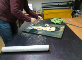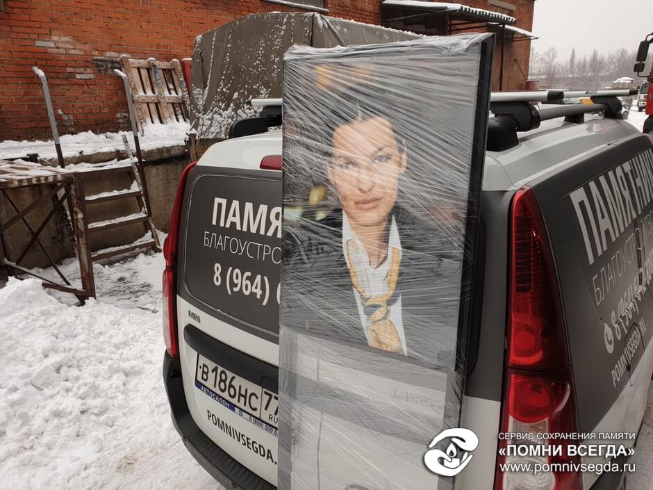 Остался последний этап – доставить портрет в рамке заказчику. Перед транспортировкой мы заматываем его упаковочной плёнкой в несколько слоёв, чтобы предотвратить любые механические повреждения. Данный заказ был выполнен нами за сутки, хотя в целом подобного рода работы занимают полтора-два дня. Как видите, если заказывать портрет у нас сразу же после смерти человека – более чем реально установить его на могилу непосредственно в день похорон.