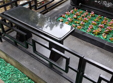 В первую очередь был установлен цветник и подставки под вазы, далее уложен пол из гранитных обожжённых плит (на них сложнее поскользнуться в холодное время года и можно уверенно ходить во влажную погоду). После этих пыльных работ настало время гравировальных работ, требующих очень аккуратного подхода к исполнению.