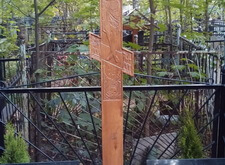 Могила стандартная, не большая. Когда-то здесь стоял гранитный памятник и была высокая ограда. После очередного захоронения плиту убрали в сторону, цветник тоже подняли, переднюю часть ограду демонтировали, установили временный крест.
